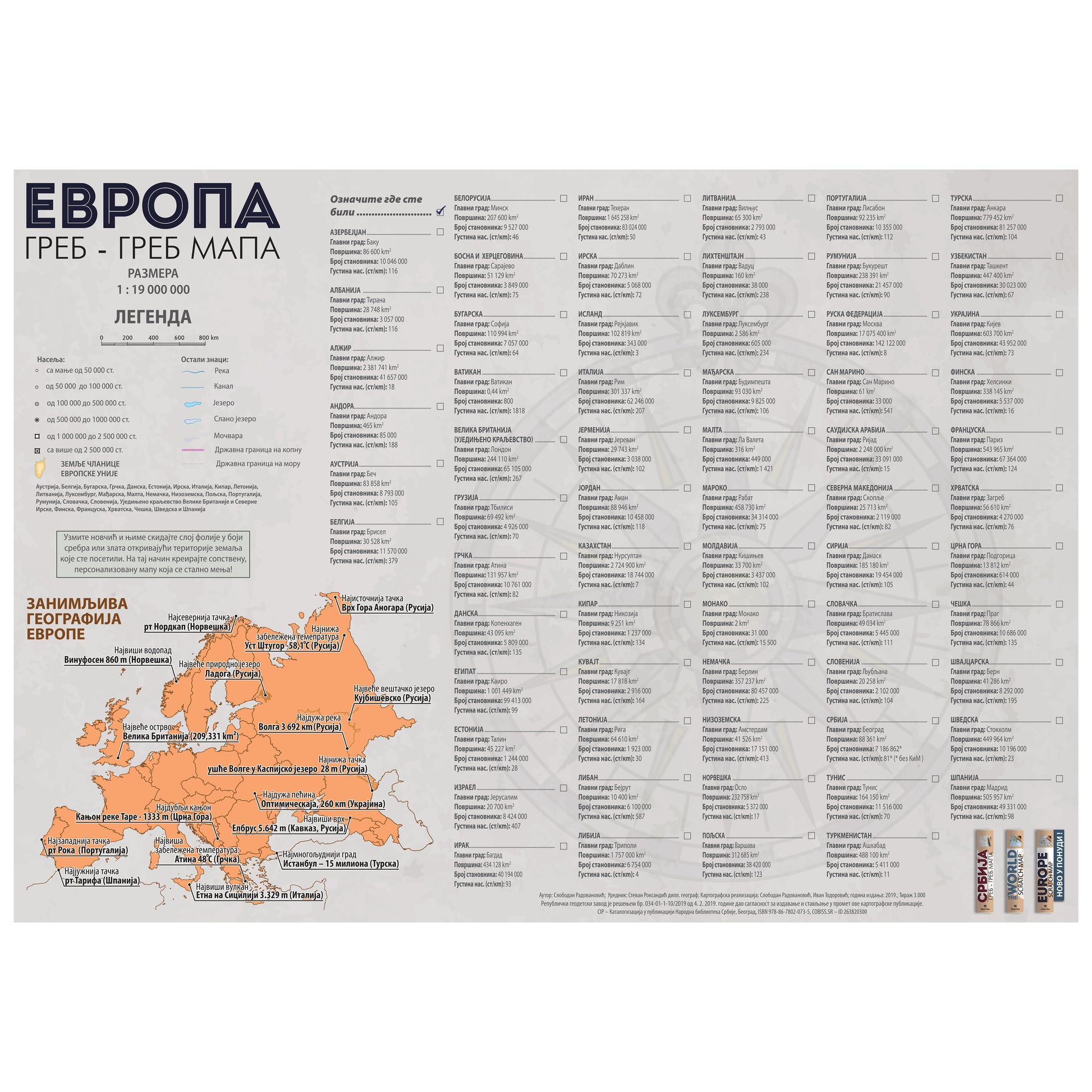 On this map, borders of each country are shown in a different color and coated with silver or gold colored foil, you can easily scratch, just like scratching off the lottery ticket, discovering detailed map of a particular country. This type of map provides an excellent way to mark countries you visited.